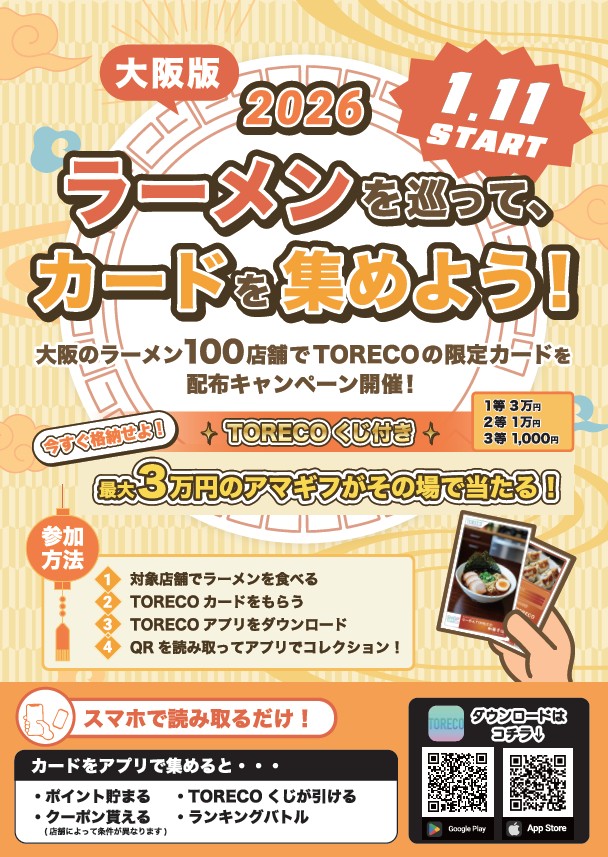 【本日開催!】大阪ラーメン SHOP TORECO 配布開始!** あなたの“いつもの一杯”が、ちょっと楽しく、ちょっと特別になる日がやってきました